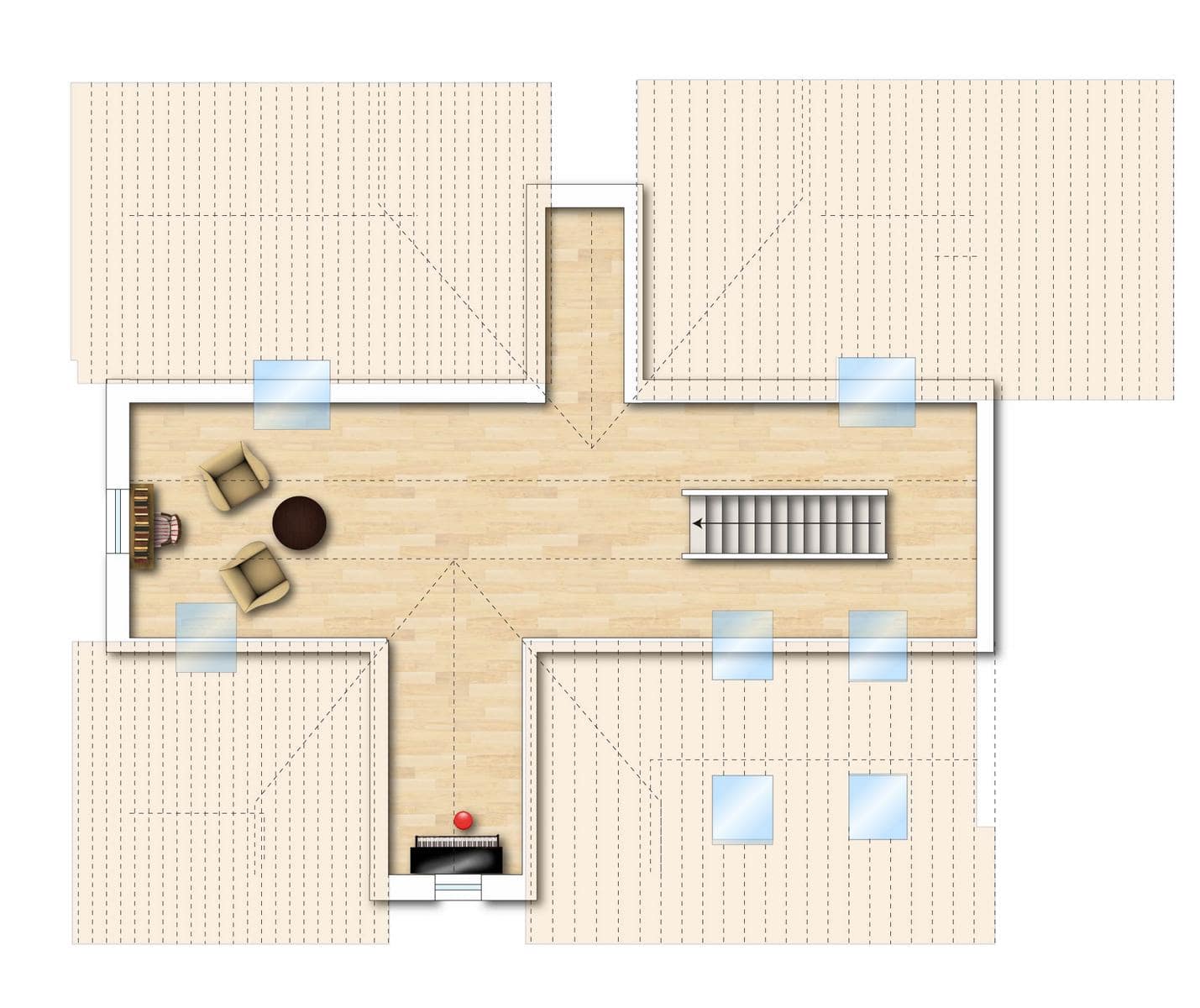 Im Flur befindet sich eine Treppe, die zur oberen ca. 45 m² großen Etage führt. Hier werden ein Studio, Schlafzimmer, Ankleideraum und Bad vorhanden sein.